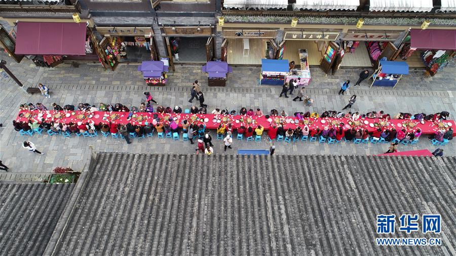 10月18日,群众在贵州省丹寨县万达小镇吃新节长桌宴上品尝佳肴(无人机照片)。 当日,贵州省黔东南苗族侗族自治州丹寨县万达小镇举办苗族吃新节体验活动。当地苗族同胞跳芦笙舞、品长桌宴,并邀请游客参与其中,大家在欢声笑语中乐享金秋。 新华社发(何宣杰 摄)