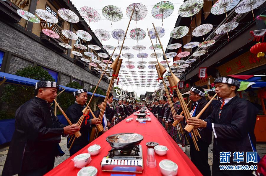 10月18日,苗族群众在贵州省丹寨县万达小镇吃新节长桌宴上助兴。 当日,贵州省黔东南苗族侗族自治州丹寨县万达小镇举办苗族吃新节体验活动。当地苗族同胞跳芦笙舞、品长桌宴,并邀请游客参与其中,大家在欢声笑语中乐享金秋。 新华社发(杨武魁 摄)