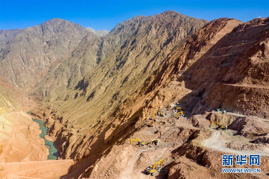 这是10月18日拍摄的新疆大石峡水利枢纽工程施工现场(无人机照片)。 新华社记者 胡虎虎 摄