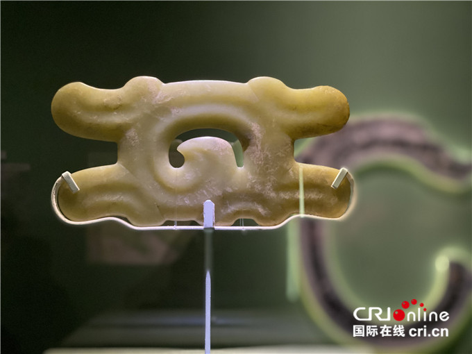 展览序厅呈现的红山文化最具代表性的3件玉器之一玉勾云形器(摄影 陈毓娟)