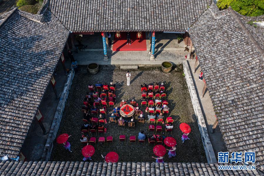 10月20日,演员在龙门古镇的祠堂里给老人们表演节目(无人机拍摄)。 一年一度的重阳节即将来临。10月20日,浙江省杭州市富阳区龙门古镇开展敬老爱老欢度重阳活动,老人们收到手工长寿面和慰问金,还观看了越剧、杂技、歌曲等精彩的慰问演出。 据了解,龙门古镇政府给镇里700多位70岁以上老人送上慰问品和慰问金,营造“敬老爱老”的良好氛围,迎接重阳节的到来。 新华社记者 徐昱 摄