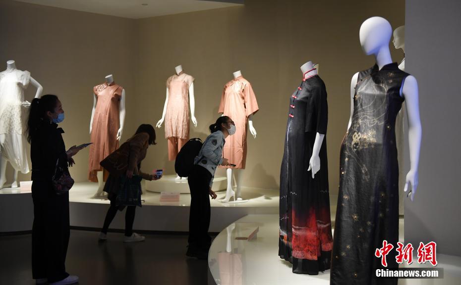 10月22日,参观者观看展出的旗袍作品。近日,“如诗:2020全球旗袍邀请展”在位于浙江杭州的中国丝绸博物馆举行,展览以“诗歌”为主题,共邀请全球多个国家及地区的设计师制作四十余件旗袍作品。中新社记者 王刚 摄