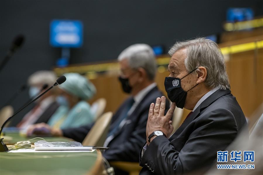 10月22日,在位于纽约的联合国总部,联合国秘书长古特雷斯(前)观看联合国日音乐会录像。