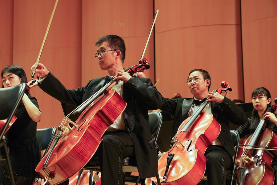10月23日,乐手在《英雄儿女》主题交响音乐会上演奏。 当日,《英雄儿女》主题交响音乐会在吉林省长春市长影音乐厅举行,现场演绎了《我的祖国》和《英雄赞歌》等长影乐团创作的著名歌曲。 新华社发(颜麟蕴 摄)