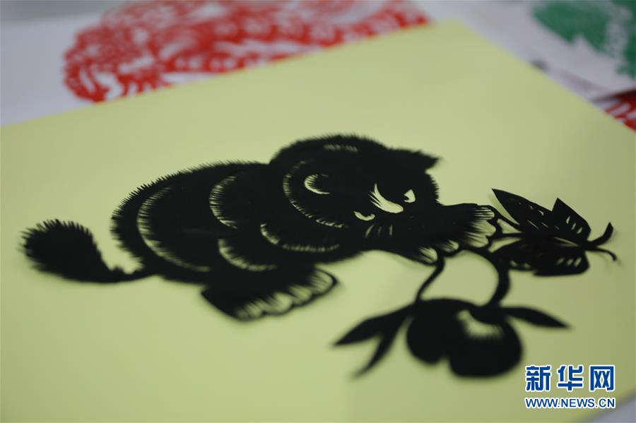 这是民间艺术家的剪纸作品《猫》(10月24日摄)。 近年来,甘肃会宁县加大对剪纸艺术的传承保护力度,建立研习所,为民间剪纸艺术家提供展示交流的机会,同时定期举办邀请展,在当地中小学开办剪纸课堂,让更多人接触和学习剪纸。 会宁剪纸历史悠久,常见题材有花卉草木、飞禽走兽、戏曲人物、民间传说等,表现形式以窗花、灯笼花和炕围花为多,2011年被列入国家级非物质文化遗产保护名录。 新华社记者 杜哲宇 摄