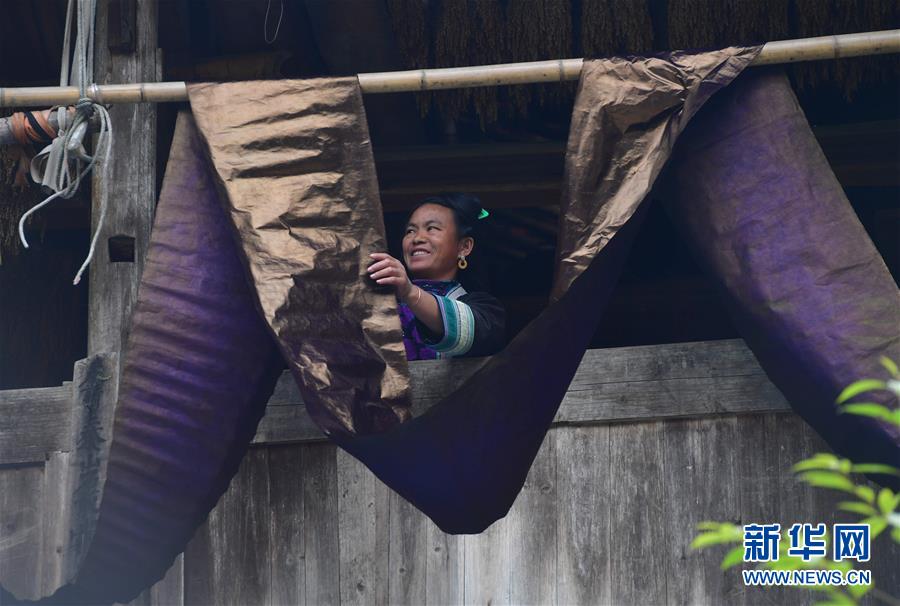10月25日,乌英苗寨村民吴雪花在晾晒亮布。新华社记者 黄孝邦 摄