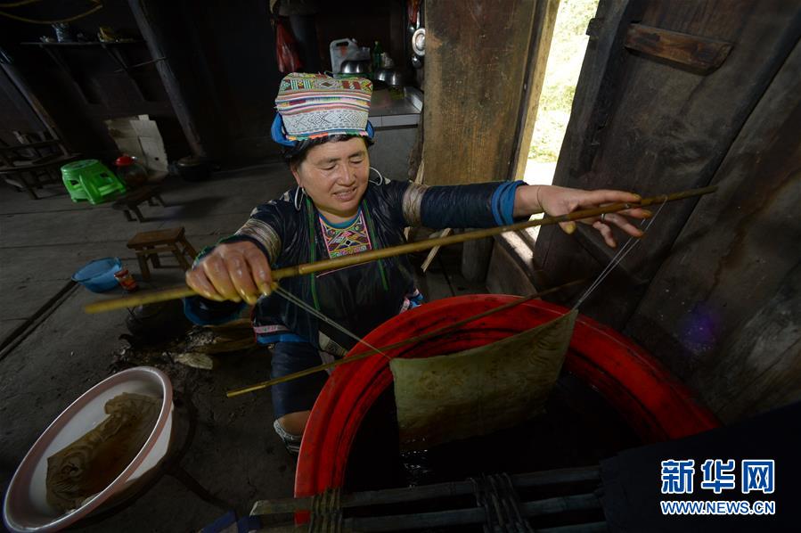 10月25日,在贵州省黔东南苗族侗族自治州榕江县兴华乡摆贝村的“扶贫作坊”,省级非物质文化遗产传承人姜老本在给蜡画染色。 新华社记者 杨楹 摄