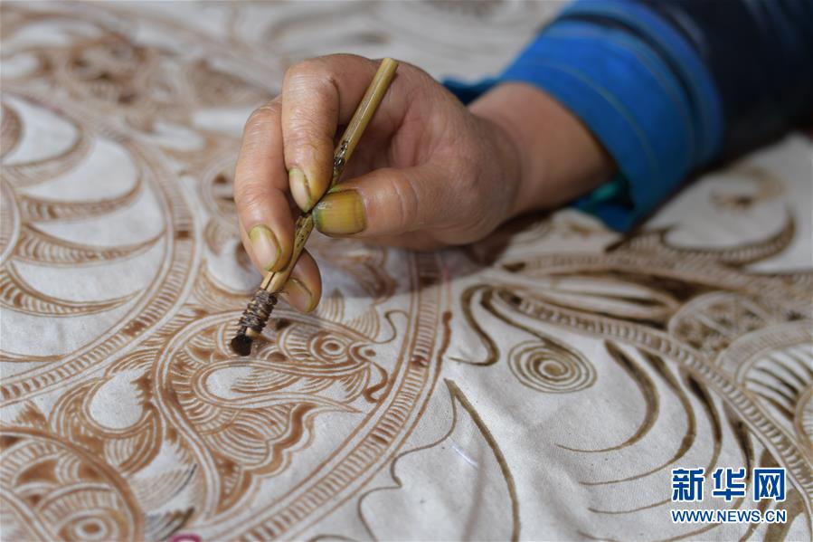 10月25日,在贵州省黔东南苗族侗族自治州榕江县兴华乡摆贝村的“扶贫作坊”,省级非物质文化遗产传承人姜老本在点蜡作画。新华社记者 杨楹 摄