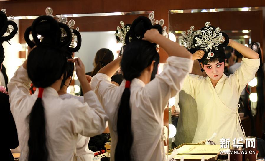 10月24日,评剧演员在河北省石家庄市丝弦剧院化装。 新华社发(陈其保 摄)