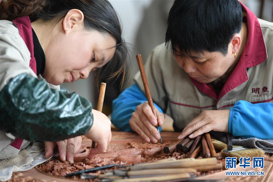 工作人员在浙江省工艺美术大师张向荣创立的明堂红木家具雕花车间内雕刻作品(10月20日摄)。 新华社记者 翁忻旸 摄