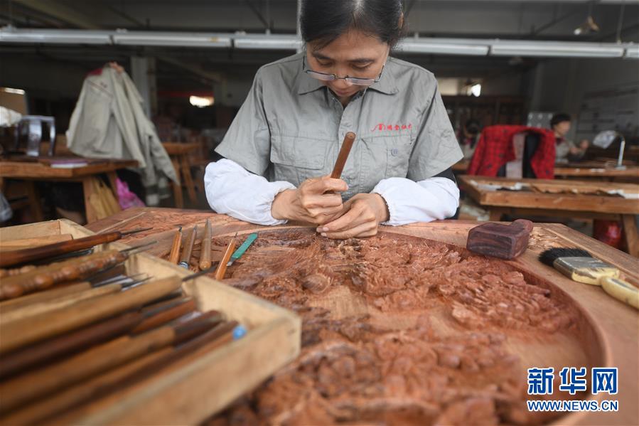 工作人员在浙江省工艺美术大师张向荣创立的明堂红木家具雕花车间内雕刻作品(10月20日摄)。 新华社记者 翁忻旸 摄
