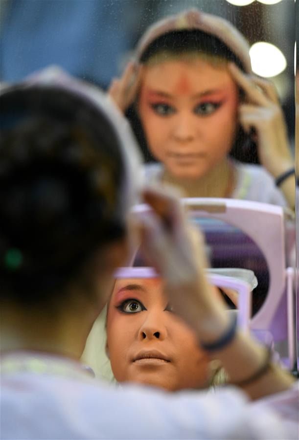10月27日,演员在河北省石家庄大剧院上妆。 从10月27日到29日,“纪念奚啸伯先生诞辰110周年”京剧专场演出活动在河北省石家庄大剧院举行。奚啸伯(1910—1977)生于北京,是我国著名京剧表演艺术家,京剧“四大须生”之一。 新华社发(陈其保 摄)