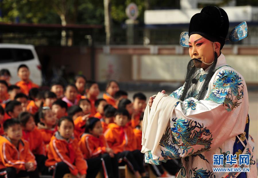 10月30日,河北省黄骅市河北梆子剧团演员在河北沧州河间市新华小学进行专场演出。 近年来,河北省沧州市组织开展戏曲文化进校园主题公益系列活动,组织当地专业剧团深入中小学校,以戏曲展演、戏曲交流互动等形式,让学生感受戏曲艺术魅力,丰富学生课余文化生活。 新华社记者 朱旭东 摄