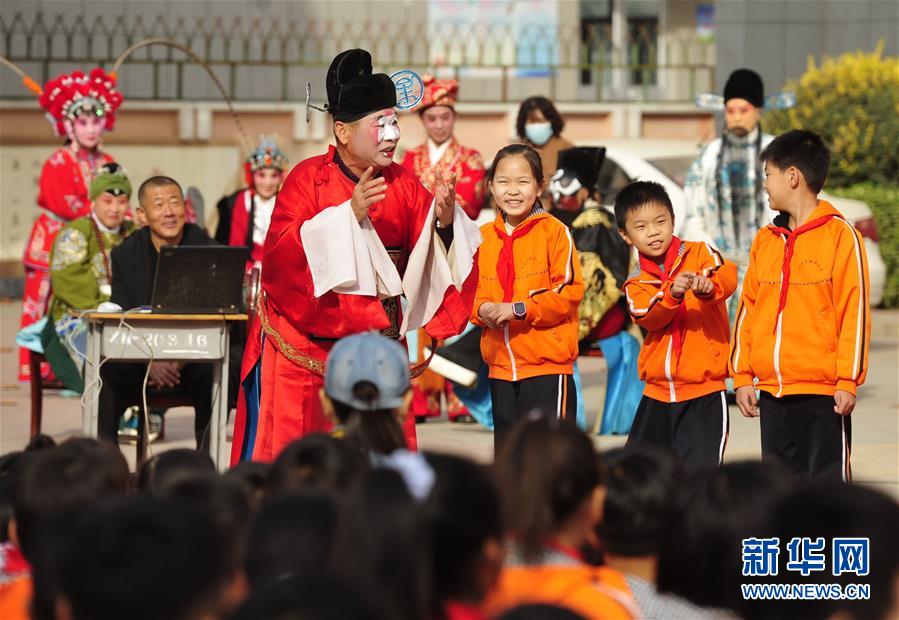 10月30日,河北省黄骅市河北梆子剧团演员在河北沧州河间市新华小学与学生互动。 近年来,河北省沧州市组织开展戏曲文化进校园主题公益系列活动,组织当地专业剧团深入中小学校,以戏曲展演、戏曲交流互动等形式,让学生感受戏曲艺术魅力,丰富学生课余文化生活。 新华社记者 朱旭东 摄