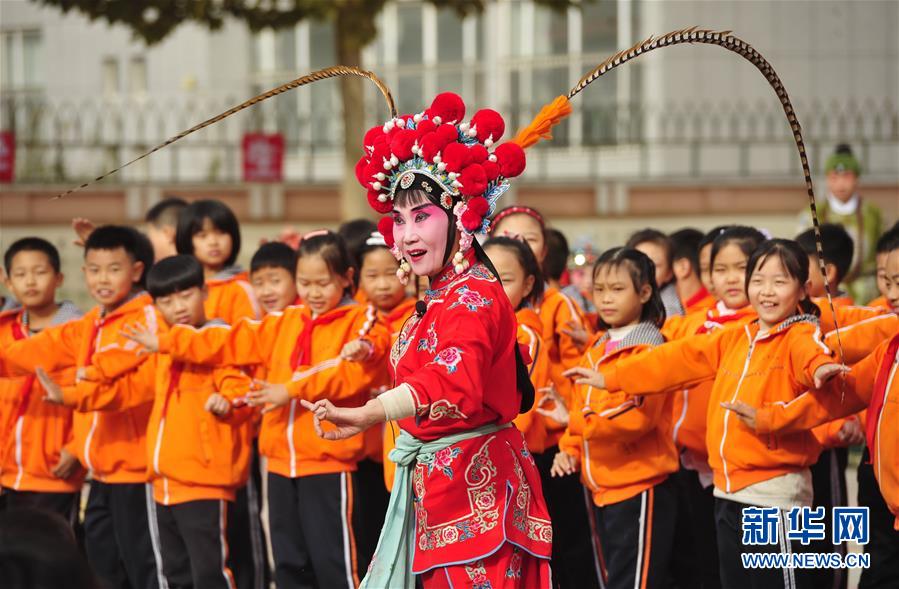 10月30日,河北省黄骅市河北梆子剧团演员在河北沧州河间市新华小学进行专场演出。 近年来,河北省沧州市组织开展戏曲文化进校园主题公益系列活动,组织当地专业剧团深入中小学校,以戏曲展演、戏曲交流互动等形式,让学生感受戏曲艺术魅力,丰富学生课余文化生活。 新华社记者 朱旭东 摄
