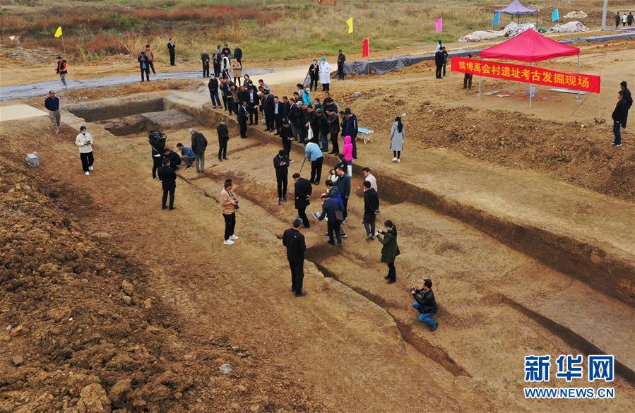 考古专家学者在禹会村遗址聚落考古发掘现场参观考察(10月29日摄,无人机照片)。 近日,安徽蚌埠禹会村遗址聚落考古取得重要成果。在前段考古工作的基础上,工作人员在遗址范围内发现了龙山文化城址。 经初步发掘,该遗址内龙山文化核心分布区发现两段城垣遗迹。城址大部分区域被淮河冲毁,城址复原规模至少18万平方米。城墙内外发现有壕沟环绕,根据壕沟内出土的陶器残片判断,城址可追溯到距今约4400至4100年前的龙山文化早中期。 新华社记者 李贺 摄