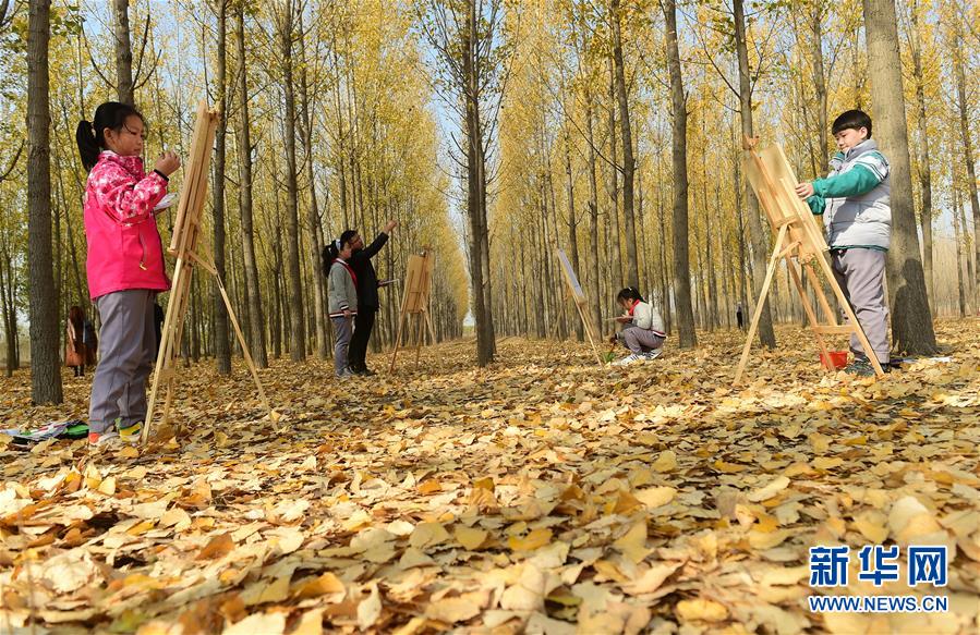 11月4日,沧州市实验小学学生在一处林地内绘画。 深秋时节,河北省沧州市实验小学美术兴趣小组的学生在老师的带领下走出教室,走进大自然,以“多彩森林”为主题,用画笔描绘斑斓秋色。 新华社发(傅新春 摄)