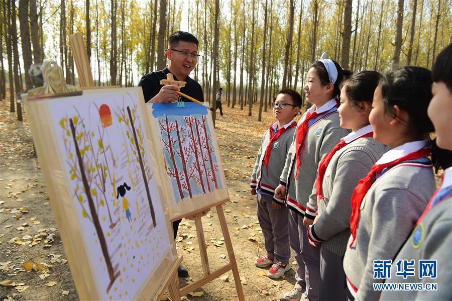 11月4日,沧州市实验小学的老师指导学生绘画。 深秋时节,河北省沧州市实验小学美术兴趣小组的学生在老师的带领下走出教室,走进大自然,以“多彩森林”为主题,用画笔描绘斑斓秋色。 新华社发(傅新春 摄)