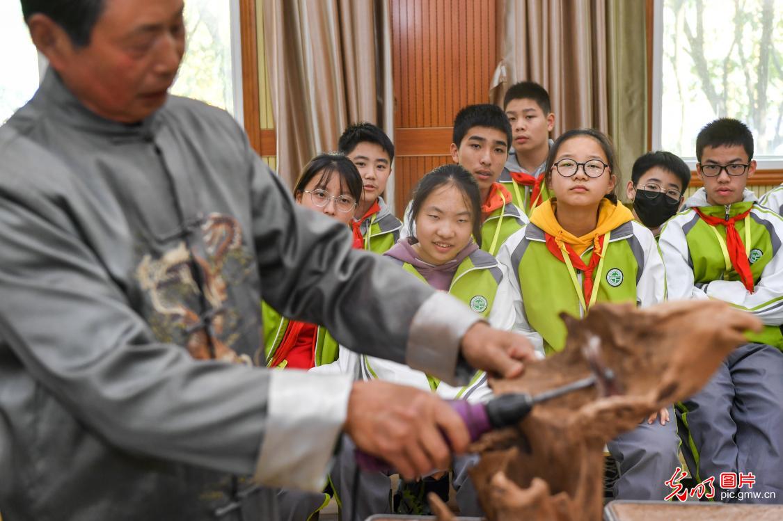 2020年11月4日,浙江省湖州市长兴县实验中学以学习本土非遗传承技艺为主题,邀请非遗传人进校园,手把手教学生学习、体验民间盘纸、根雕、竹刻等传统技艺,感受中华传统非遗文化的魅力,增强文化自信。(谭云俸摄/光明图片)