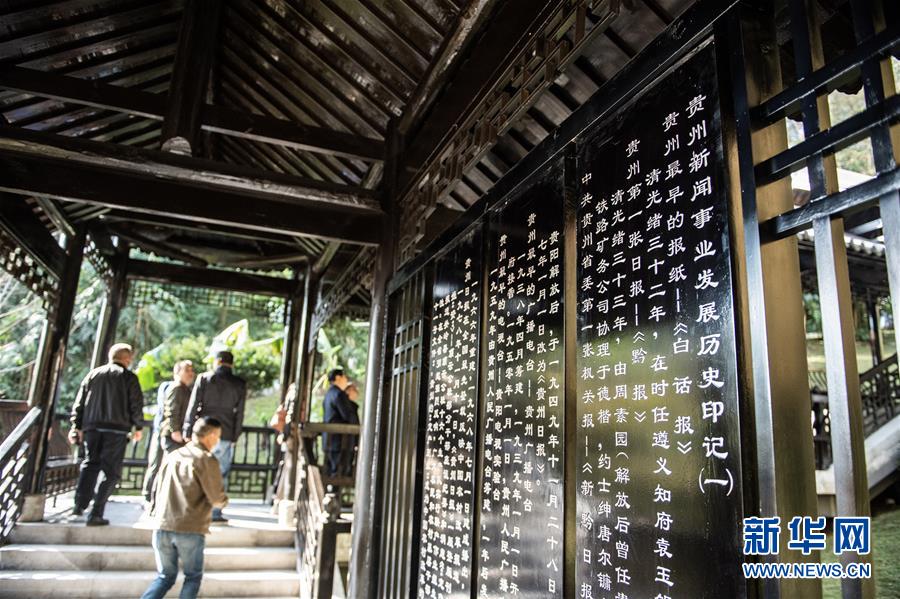 11月8日,参观者经过贵州新闻文化亭廊。 当日,贵州新闻文化亭廊在贵州省新闻界庆祝第二十一个中国记者节交流会上举行落成仪式。贵州新闻文化亭廊位于贵阳市黔灵山公园,该项目旨在加强贵州省新闻界精神文化建设、扩大对外新闻交流合作。 新华社记者 陶亮 摄