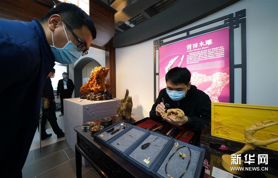 11月8日,非遗传承人林建军(右)在演示莆田木雕技艺。在第三届中国国际进口博览会上,参展的中国非遗项目让来自全球各地的展商领略中国文化的魅力,促进经贸合作的同时,也加强了文化交流和民心相通。新华社记者 王建华 摄