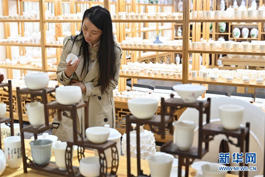 10月20日,一名网络主播挑选徐金宝制作的白瓷茶具,准备上线直播销售。 新华社记者 宋为伟 摄