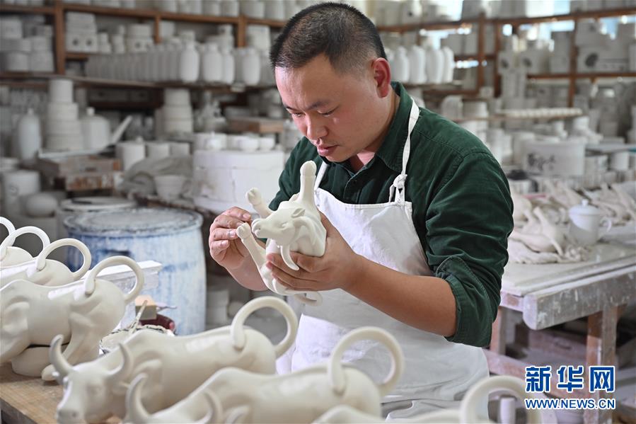 10月20日,徐金宝为白瓷工艺品修坯。 新华社记者 宋为伟 摄