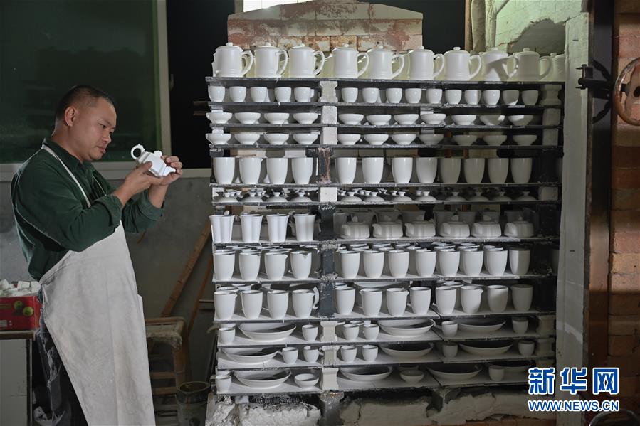 10月20日,徐金宝查看刚出窑的白瓷茶具。 新华社记者 宋为伟 摄