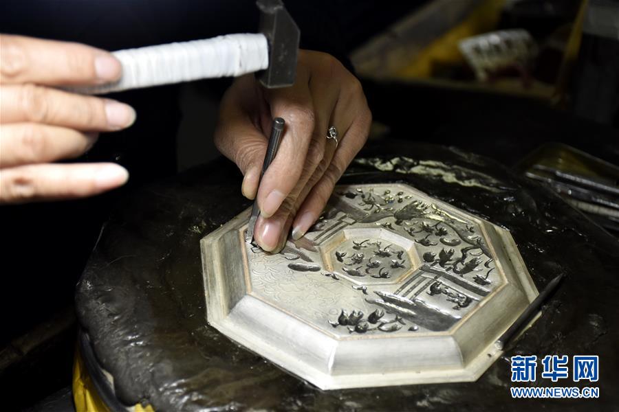 11月11日,在洛阳市洛龙区白马寺镇一家金银器加工企业,工人在金银器上雕刻花纹。 河南省洛阳市白马寺金银器制作技艺是河南省非物质文化遗产,经过捶打塑形、描样錾刻、雕镂镶嵌、焊接鎏金等多道工序,以手工为主制作各类金银器具。 新华社记者 韩朝阳 摄