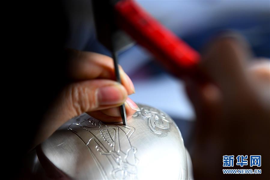 11月11日,在洛阳市洛龙区白马寺镇一家金银器加工企业,工人在金银器上錾刻。 河南省洛阳市白马寺金银器制作技艺是河南省非物质文化遗产,经过捶打塑形、描样錾刻、雕镂镶嵌、焊接鎏金等多道工序,以手工为主制作各类金银器具。 新华社记者 郝源 摄