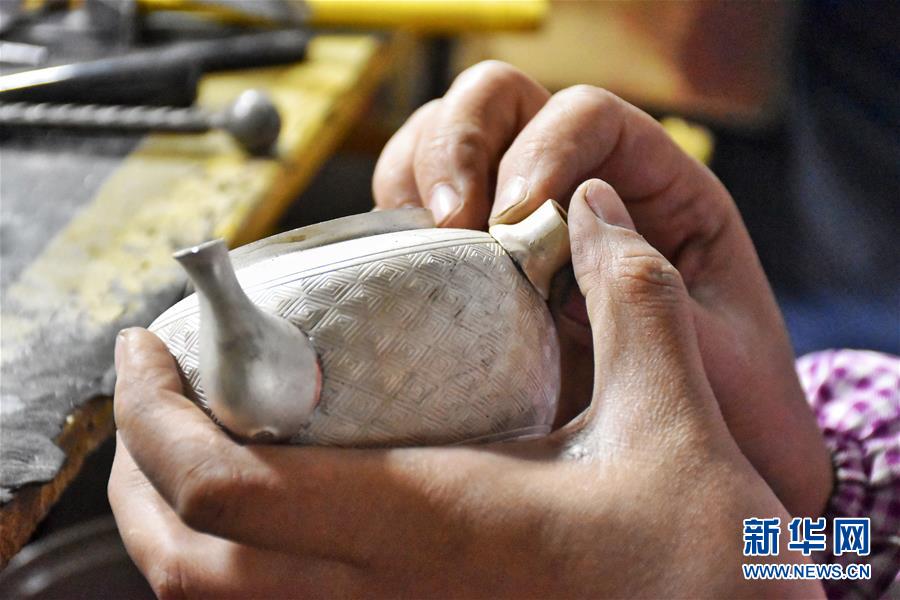 11月11日,在洛阳市洛龙区白马寺镇一家金银器加工企业,工人在加工金银器。 河南省洛阳市白马寺金银器制作技艺是河南省非物质文化遗产,经过捶打塑形、描样錾刻、雕镂镶嵌、焊接鎏金等多道工序,以手工为主制作各类金银器具。 新华社记者 韩朝阳 摄