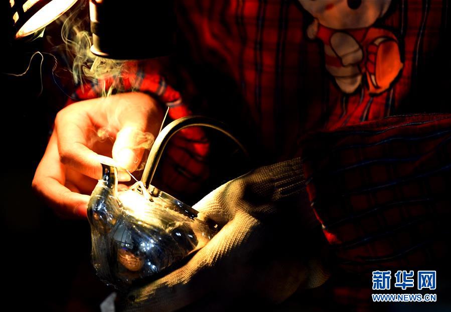 11月11日,在洛阳市洛龙区白马寺镇一家金银器加工企业,工人对金银器进行焊接作业。 河南省洛阳市白马寺金银器制作技艺是河南省非物质文化遗产,经过捶打塑形、描样錾刻、雕镂镶嵌、焊接鎏金等多道工序,以手工为主制作各类金银器具。 新华社记者 郝源 摄