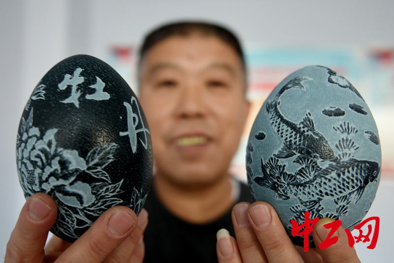2020年11月12日,河北张家口,乔长贵展示自己的蛋雕作品。来源:陈晓东/视觉中国