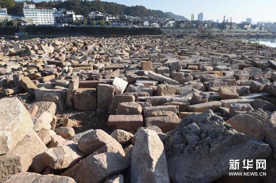 这是11月12日拍摄的打捞上来的镇海桥石料构件。新华社记者 周牧 摄