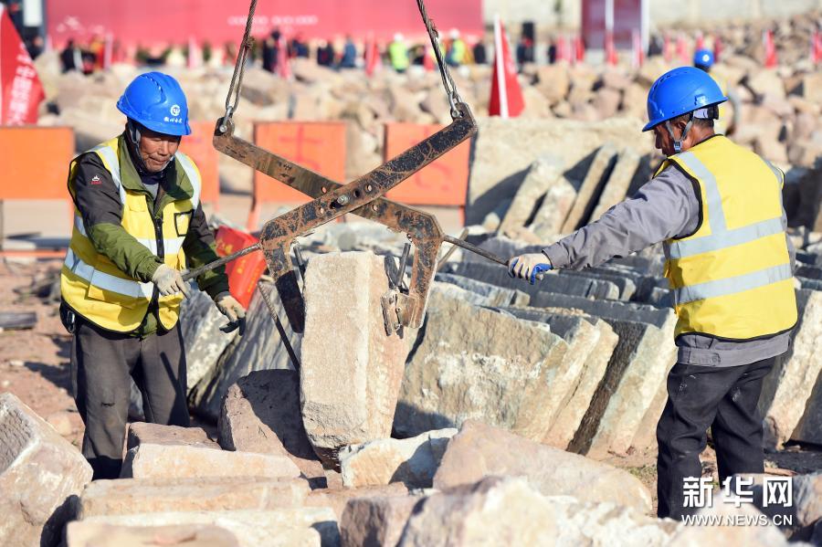11月12日,在黄山市镇海桥修缮工程施工工地,施工人员在清点打捞上来的镇海桥石料构件。新华社记者 周牧 摄