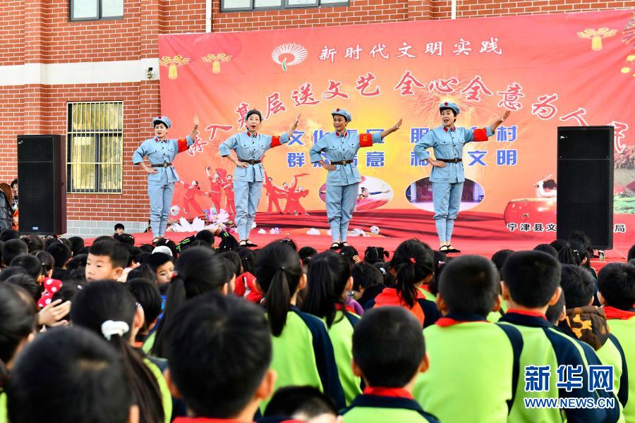 11月13日,在宁津县晗子希望小学,文艺惠民演出小分队志愿者在表演京剧。新华社记者 郭绪雷 摄