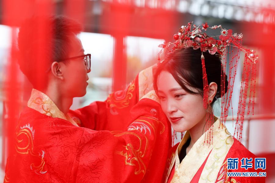 11月16日,新人在婚礼仪式上整理头发。新华社记者 欧东衢 摄