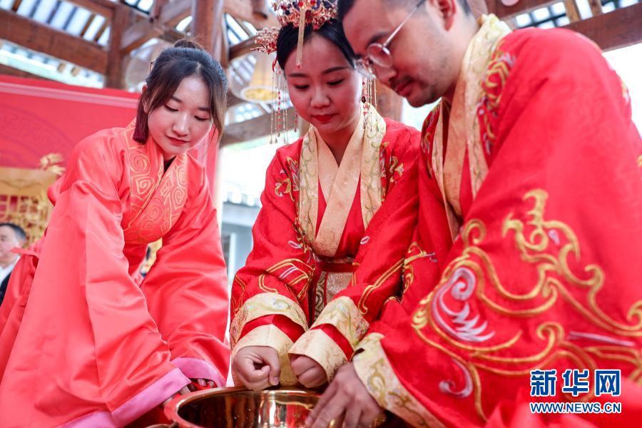 11月16日,新人在婚礼现场引水沃盥。新华社记者 欧东衢 摄