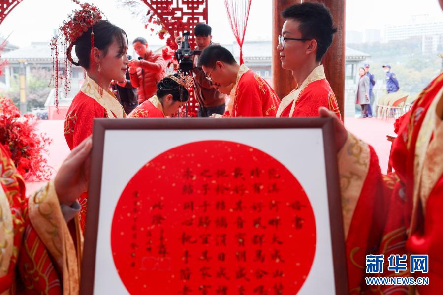 11月16日,新人在婚礼上展示婚书。新华社记者 欧东衢 摄