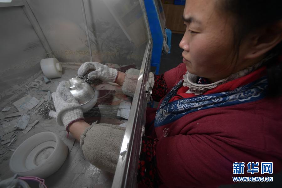 11月17日,工人在贵州省丹寨县国春银饰扶贫就业工坊赶制银质碗。新华社记者 杨楹 摄