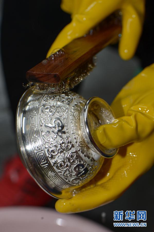11月17日,工人在贵州省丹寨县国春银饰扶贫就业工坊赶制银质碗。新华社记者 杨楹 摄