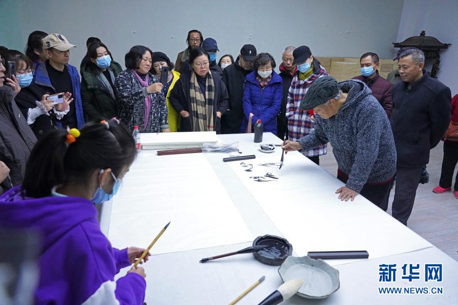 11月21日,在北京中艺国际展览馆举行的“爱的阳光·决胜小康”残健融合仁美书画展上,书画家代表与观众进行笔会交流。