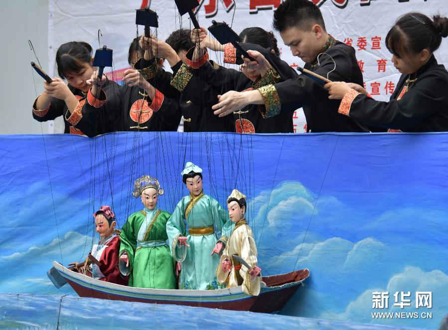 演员在舞台上操纵木偶演出成语“刻舟求剑”的故事(11月23日摄)。新华社记者 李贺 摄