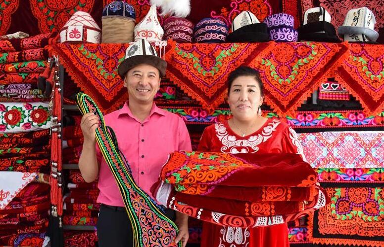 9月20日,在新疆阿克陶县丝路佳苑手工艺合作社内,艾拉努尔·吾普尔(右)和丈夫乃再尔·依迪西(左)展示绣品。艾拉努尔·吾普尔和丈夫开了一家手工艺合作社,带动了周边20户搬迁居民就业。