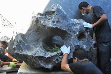 9月8日,国资委轻工机关服务中心向圆明园管理处捐赠流散文物1件。此文物为太湖石,上面刻有乾隆皇帝为圆明园狮子林题写的诗句。
