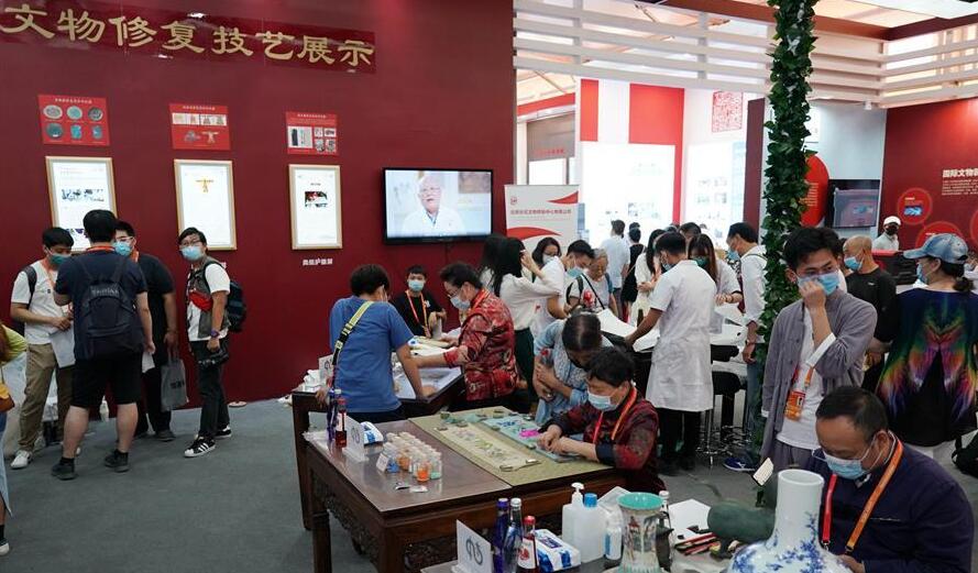 9月8日,观众在服贸会上参观文物修复技艺展示。 2020年中国国际服务贸易交易会9月4日至9日在北京举行。在本届服贸会文化服务专题展区,文物修复专家现场展示文物修复技艺,让观众近距离感受文物修复过程。