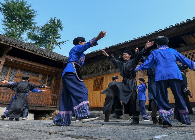 金秋时节,舍米湖村农作物进入采收季,当地村民身着民族服装,跳起土家族摆手舞欢庆丰收。