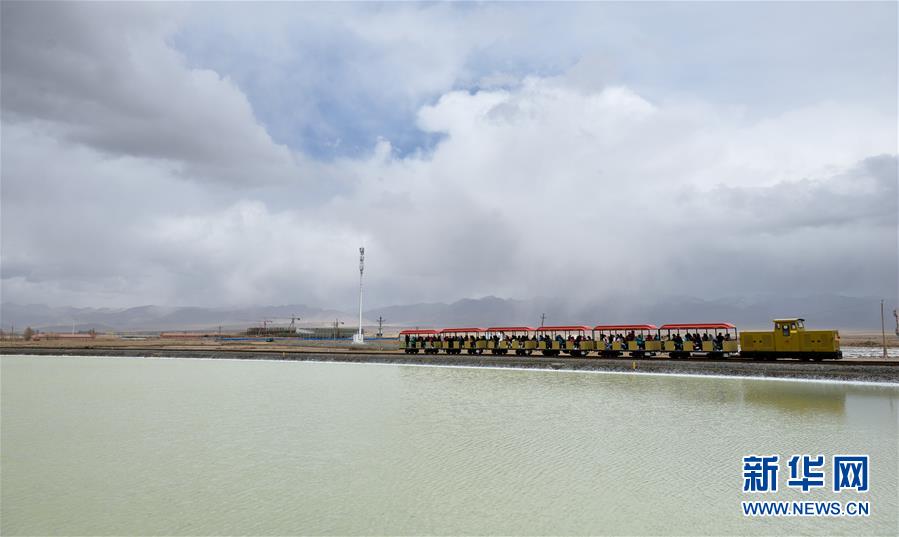 4月26日,游客们在茶卡盐湖景区内乘坐观光火车游玩。新华社记者吴刚摄