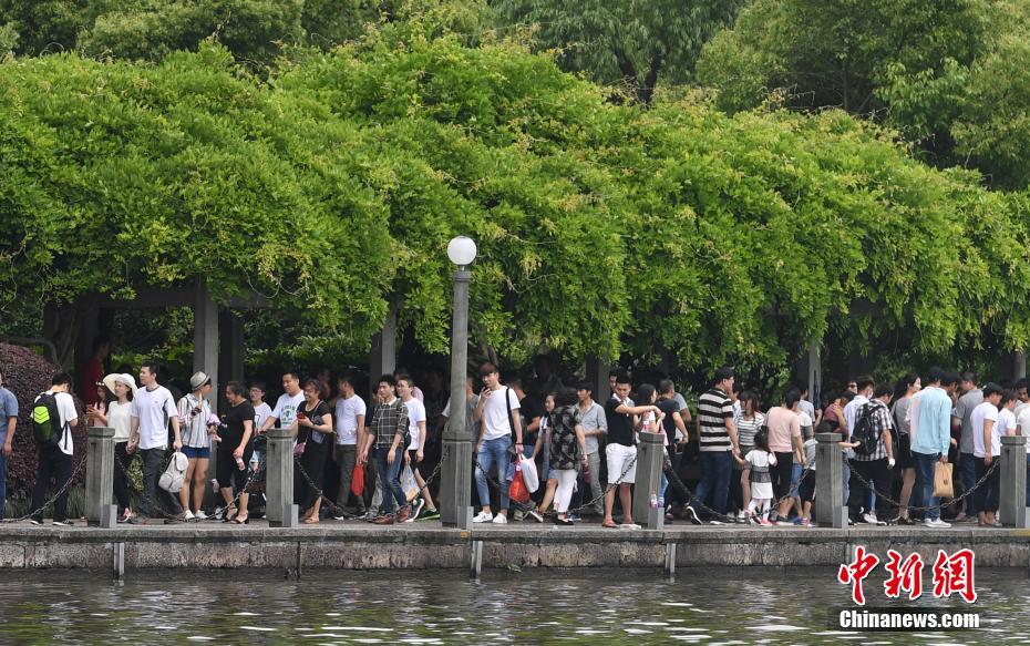 5月1日,西湖边游客“摩肩接踵”。 中新社记者 王刚 摄