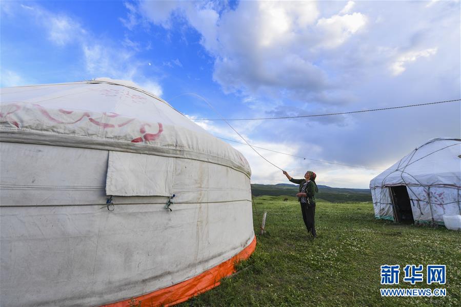 在新疆裕民县巴尔鲁克山中的一处夏季牧场,玛依拉·朱玛什在整理毡房。她以三座毡房在这里开办牧家乐,旅游旺季时月收入在5000元左右(6月22日摄)。新华社记者胡虎虎摄